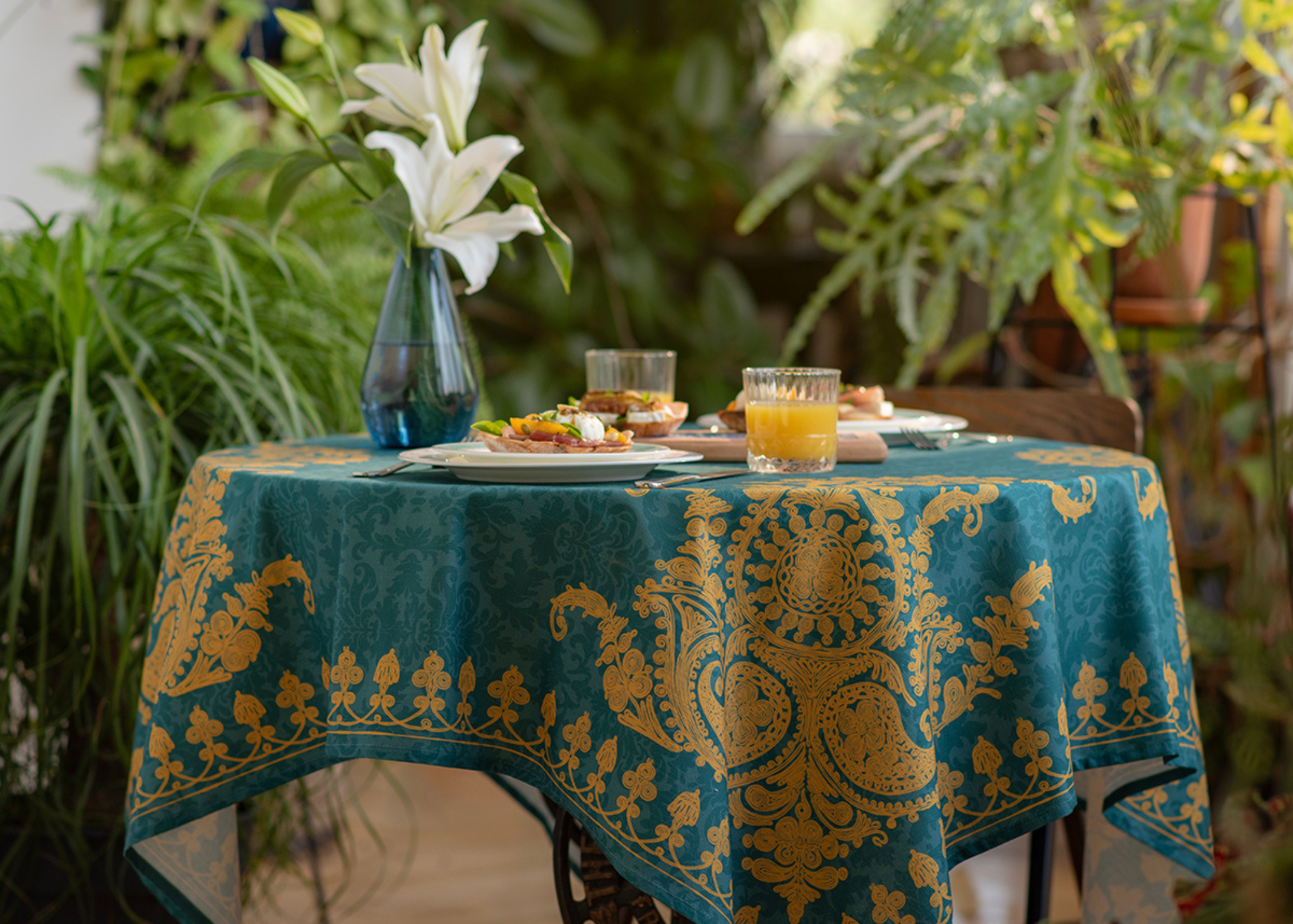 The Bagrationi tablecloth by BlueTabla is inspired by a historic textile once owned by the Bagrationi family, Georgia’s royal dynasty whose presence shaped the country for more than a thousand years. The design draws from the patterns, proportions, and color language of the original cloth, reinterpreted for contemporary interiors.